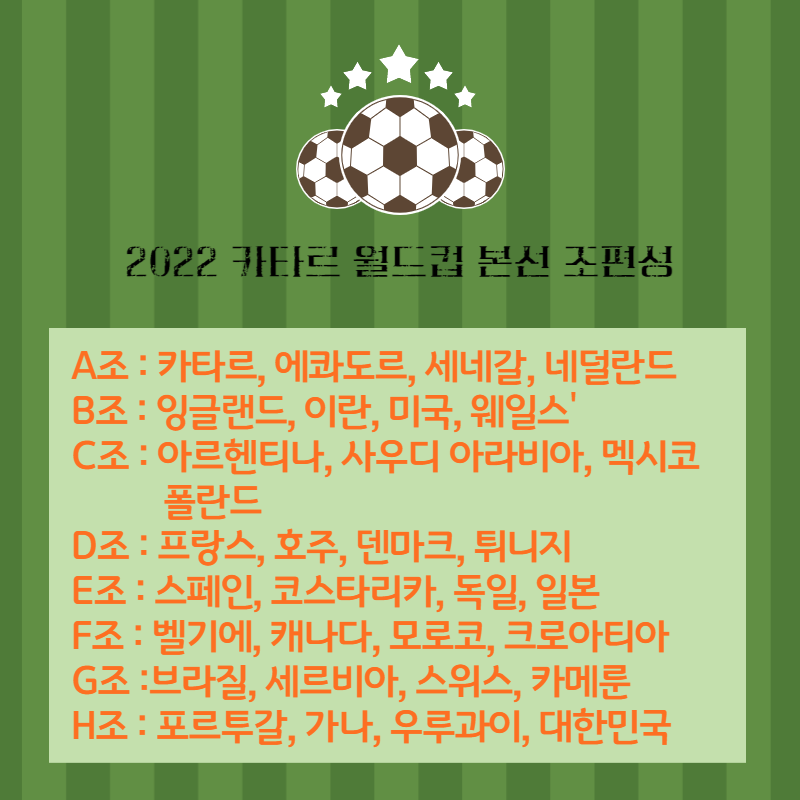 2022년은 4년에 한 번 열리는 월드컵이 있는 해입니다. 축구 마니아들은 친선경기 때부터 열띤 응원과 관심을 보이고 있습니다. 올해는 카타르에서 월드컵이 개최하게 되었습니다. 오늘은 2022 카타르 월드컵 본선에 오른 조 편성과 경기 일정을 정리해 보겠습니다.